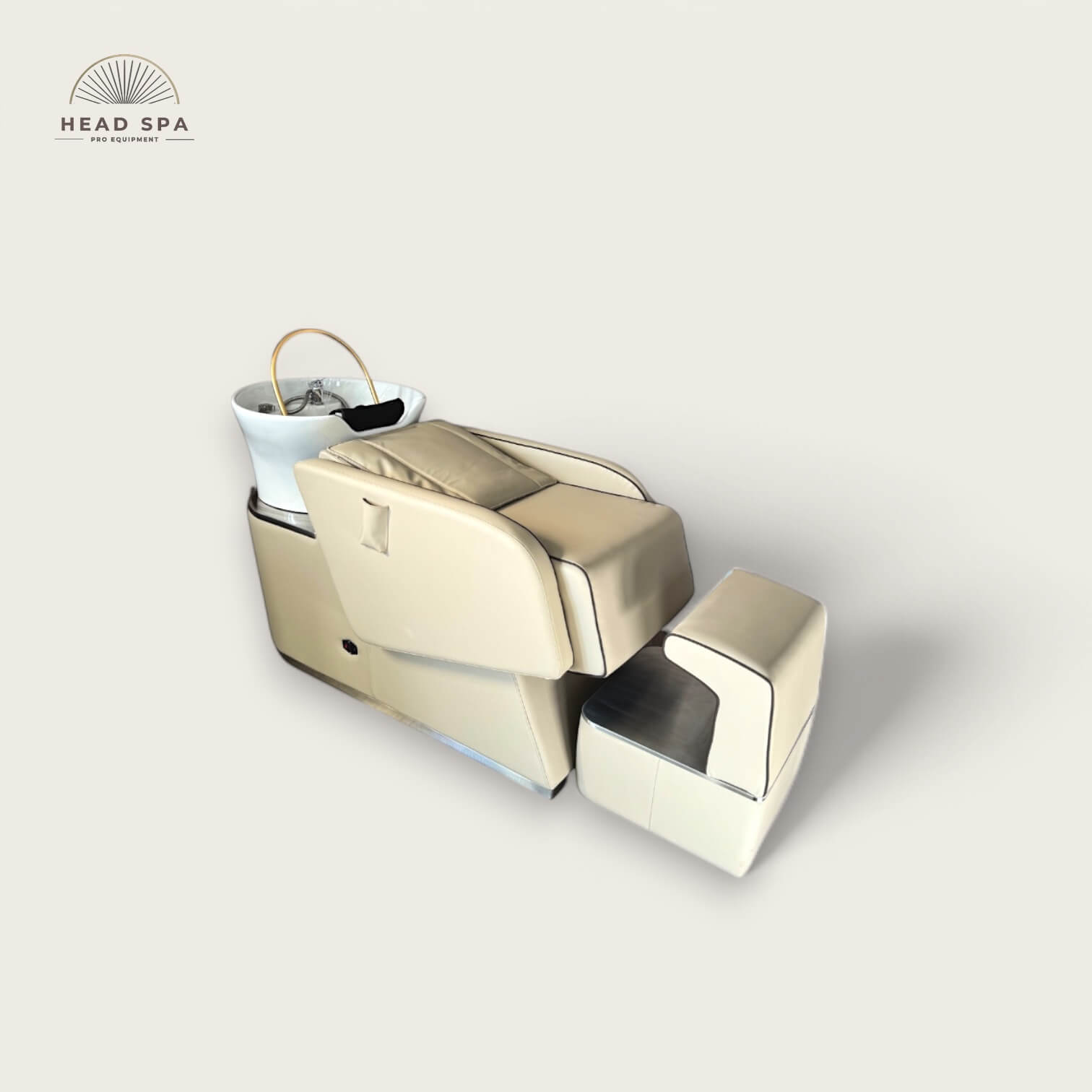 Le fauteuil Miyazaki allie design naturel et technologie de massage avancée pour une expérience Head Spa complète. Équipé d’un système de conduite d’eau (eau chaude, froide, évacuation), d’un pommeau LED extensible, d’une arche dorée avec jet d’eau et d’un bain vapeur, il est idéal pour les soins capillaires et de relaxation en salon. Dimensions : 192 x 72 x 78 cm.