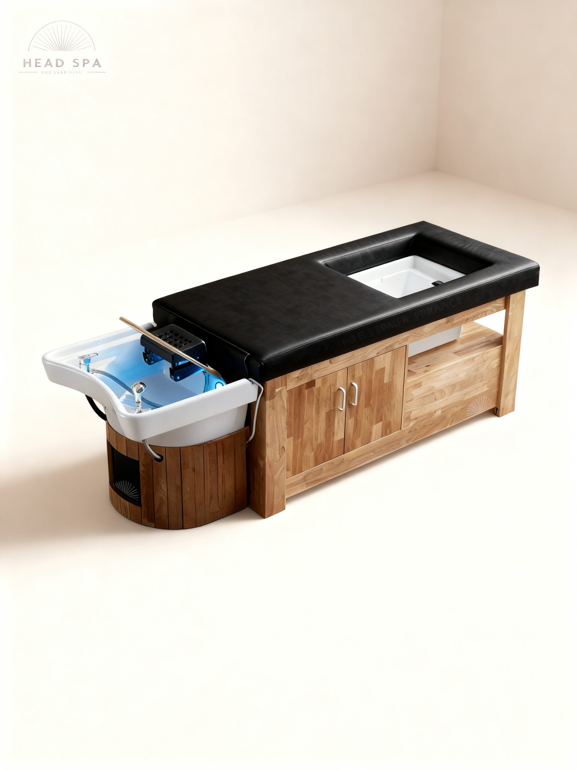 La table Spa combine soins capillaires et pédicure dans un design chaleureux en bois de hêtre. Elle intègre un matelas de 14 cm, un lavabo en céramique, un bac à pédicure encastré, des rangements, une douchette extensible et une arche dorée rotative avec jet d’eau. Le système de fumigation et l’éclairage LED apportent une touche apaisante. La possibilité de personnaliser les couleurs en fait un choix idéal pour les professionnels exigeants.
